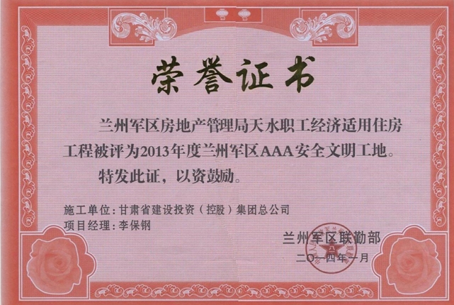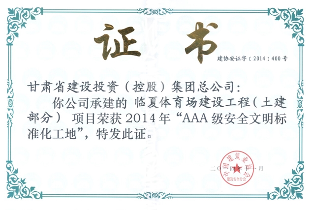 公司五年內(nèi)無死亡事故及無重大環(huán)境污染和擾民事件的發(fā)生,安全生產(chǎn)合格率100%,施工產(chǎn)值達到192707.82萬元,竣工面積為1684836m2;臨夏市體育場項目榮獲“全國AAA級安全文明標準化工地”,蘭州軍區(qū)天水職工住宅樓項目榮獲蘭州軍區(qū)“AAA級安全文明工地”,甘肅省人民醫(yī)院住院部二期7號樓8號樓項目、東川棚戶區(qū)改造AD塊9號樓10號樓項目、古浪昌靈小區(qū)公租房項目榮獲甘肅省省級文明工地,西寧城市綜合管廊項目榮獲青海省安全標準化示范省級文明工地獎項 。