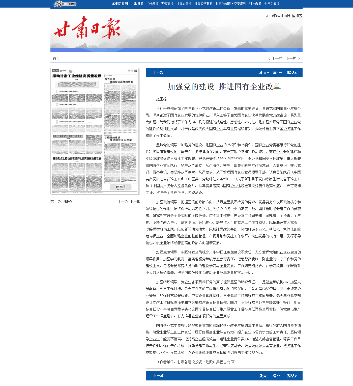 甘肅日?qǐng)?bào):加強(qiáng)黨的建設(shè) 推進(jìn)國(guó)有企業(yè)改革