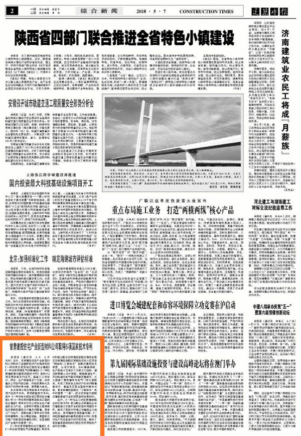 建筑時報(bào):甘肅建投住宅產(chǎn)業(yè)新型材料公司取得6項(xiàng)國家技術(shù)專利