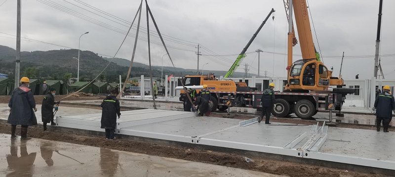 因疫情和連續(xù)降雨天氣,給施工造成一定困難,項(xiàng)目部全體人員風(fēng)雨里、泥濘中拼搏共進(jìn),分秒必爭(zhēng),加快“逆行”腳步,顧不得休息,24小時(shí)不間斷輪班施工,全力以赴,統(tǒng)籌協(xié)調(diào)人力、物力、機(jī)械。截至目前已完成100間集裝箱的框架安裝和40套墻板安裝任務(wù),衛(wèi)浴設(shè)施及水電也在緊張施工過(guò)程中,剩余未完成工程量的材料已全部發(fā)貨,其他要素正逐項(xiàng)配齊。