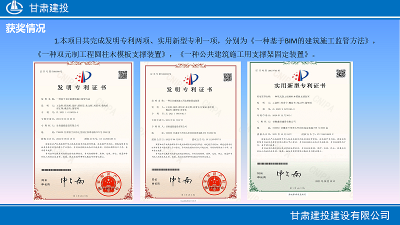 此前該項(xiàng)目還授權(quán)發(fā)明專利2項(xiàng)、實(shí)用新型專利1項(xiàng),獲評(píng)省級(jí)工法1項(xiàng),獲得省、市級(jí)文明工地、甘肅省建筑業(yè)智慧工地示范工程、甘肅省建筑業(yè)綠色施工示范工程、綠色建造施工水平評(píng)價(jià)二星級(jí)、首屆(2020)全國(guó)數(shù)字項(xiàng)目大獎(jiǎng)賽二等獎(jiǎng)等獎(jiǎng)項(xiàng)。